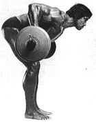 Ausführung Im Stehen, die Füße ein paar Zentimeter auseinander, fassen Sie die Hantel mit weitem Obergriff. Mit leicht gebeugten Knien beugen Sie sich vor, bis der Oberkörper etwa in der Horizontalen ist. Halten Sie den Rücken gerade, und lassen Sie die Hantel in Armeslänge unter sich herabhängen, so daß sie fast das Schienbein berührt. Heben Sie hauptsächlich die Rückenmuskeln einsetzend - die Hantel hoch, bis die Stange die oberen Bauchmuskeln berührt. Lassen Sie sie dann wieder kontrolliert in die Ausgangsstellung herab, und beginnen Sie anschließend sofort mit der nächsten Wiederholung. Es ist wichtig, den Rücken arbeiten zu lassen, damit keine Bizepsübung daraus wird. Bringen Sie die Stange nicht zur Brust hoch, sondern nur bis zum Bauch, um den Einsatz der Arme gering zu halten.