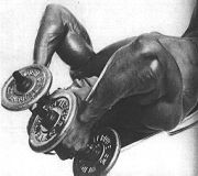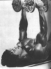 Ausführung Legen Sie sich auf eine Bank, Kopf auf dem Bankende liegend, Knie gebeugt, Füße flach auf der Bank. Halten Sie zwei Kurzhanteln gerade hoch, Arme gestreckt, Handteller einander zugewandt. Ohne die Ellbogen zu bewegen, lassen Sie die Kurzhanteln zu beiden Seiten des Kopfes herab, bis der Trizeps völlig gedehnt ist und die Gewichte die Schultern berühren. Drücken Sie die Gewichte wieder hoch, aber bringen Sie die Arme zur Streckung, bevor sie in der Vertikalen sind, und spannen Sie den Trizeps oben an.